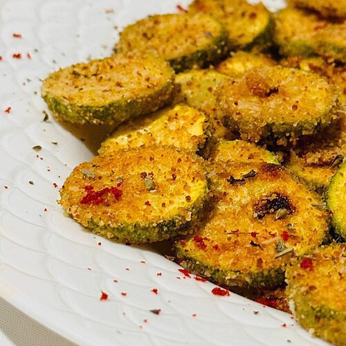 Thinly zucchini Chips coated with breadcrumbs, spices and finely grated parmesan cheese. They’re baked until golden brown and crispy. A great replacement for any fried chippity-chip!