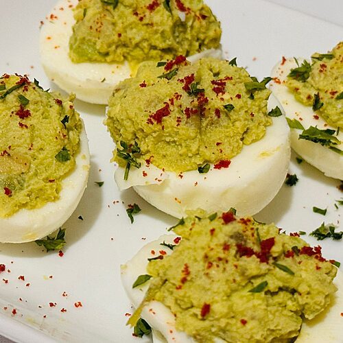 A simple, yet brilliant appetizer recipe. Hard-boiled egg halves filled with a rich and creamy texture with NO MAYO. If you like guacamole, then you’ll fall head over heels for this recipe, the avocado mixed with the cilantro and lime juice are reminiscent of a good guacamole. Since these deviled eggs are homemade and prepped with fresh and healthy ingredients; they make a great way to add protein to your healthy diet.
