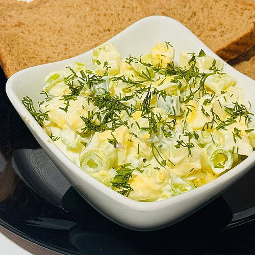 Chopped hard boiled eggs, green onions, cucumber, and a pinch of salt mixed with just the right amount of plain yogurt for a nice rich and creamy salad. This is the perfect side dish for a barbecue lunch or picnic. It’s also a tasty breakfast idea and a satisfying vegetarian lunch, brunch or dinner.