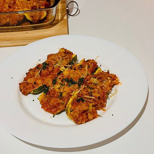 Which zucchini should I use? Make sure to choose medium or large firm zucchini to have enough filling space. (be careful not to scoop out too much of the flesh, the zucchini edges should be sturdy to hold the filling while baking).