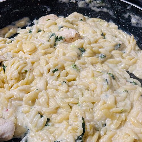 It’s a 30 min dinner idea: This orzo and chicken recipe is very convenient dinner idea for busy days. Everything is prepared in a single pan and served in about 30 minutes.