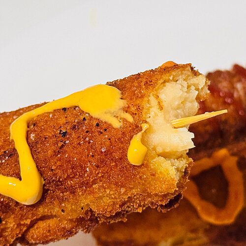 In a frying pan, heat the oil to 350 degrees Fahrenheit. Plunge the skewered cheese sticks in the cold batter and swirl slightly to cover all sides. Next, coat with panko bread crumbs, then gently place in the frying oil.