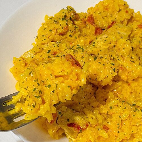 Can I keep this rice recipe vegetarian? Absolutely! You can either replace the chicken with Tofu or with vegetables you prefer like spinach, peas, bell peppers, zucchini., black beans and corn.