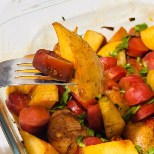 These two star ingredients create a delightful contrast which produces a delicious and well balanced dish. Smoked sausage brings a rich and savory flavor, while the baby potatoes add a creamy and comforting touch with their crispy outer layer and tender interior. Once baked, the potato pieces will absorb all the seasoning and meaty sausage flavors.