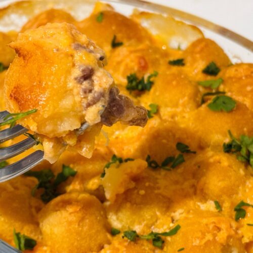 How can I replace tater tots? You can use mashed potatoes, frozen hash browns, or frozen French fries. You can also use cauliflower tots for a lower calorie version of this recipe. I’ve already tried the same recipe with air fried potato cubes.