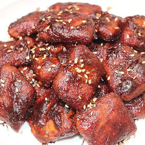 Toss the hot and crispy chicken nuggets with the orange BBQ sauce until well coated.