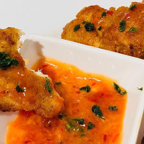 Line a large plate with paper towel and lay on it the chicken pieces to absorb any excess oil. Next, mix the chicken pieces with the bang bang sauce and garnish with chopped parsley. Enjoy!
