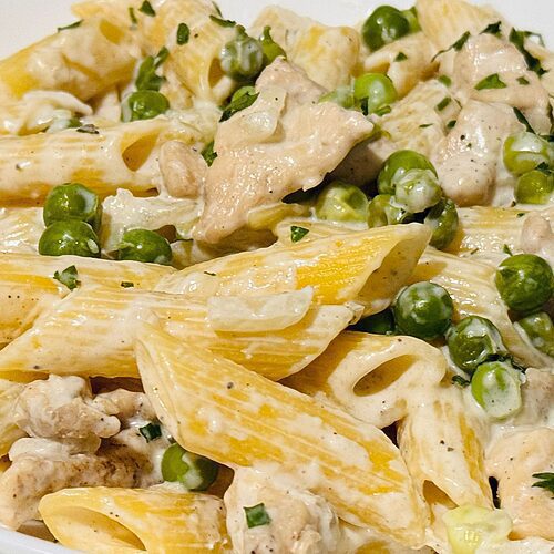 Boil a large pot of salted water and add the pasta. Halfway through cooking your pasta, add in 1 cup frozen peas to the pot. Cook your penne pasta until al dente and don’t forget to check the back of the package for instructions.