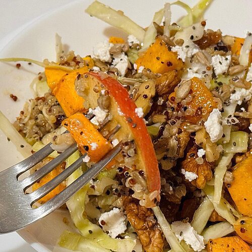 Finally, assemble your salad by adding the apples, quinoa, and butternut squash and toss gently to combine.