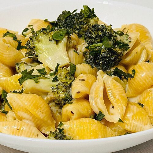 Allow your liquid to heat up then add the pasta. Immerse the pasta into the liquid and bring it to a boil. Cook partly covered according to package instructions. Add your broccoli during the last 5 minutes until it softens up a bit- Don’t forget to occasionally stir the pasta to prevent it from sticking.