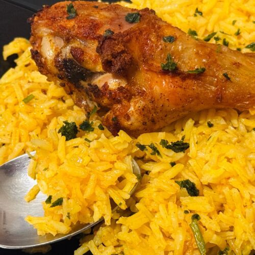 Gently arrange the seasoned chicken on top of the rice (make sure the chicken thigh fillets are separated). Use foil to cover the baking dish and let it bake for 30 minutes, giving the rice enough time to cook and take in the flavors)