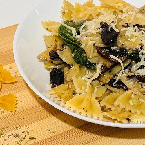 Push the spinach to one side, add the sautéed mushrooms, and the cooked pasta to the same pan. Add the grated Parmesan cheese, the remaining tablespoon of olive oil, and the Italian seasoning. Stir really well to combine.