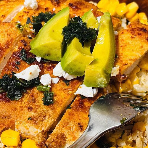 The final step is assembling the bowls (you can divide these ingredients among four bowls). Transfer the cilantro-lime rice to a bowl, top with the crispy chicken breast and corn. Garnish the bowl with sliced avocado, cilantro or sliced jalapeno. Enjoy!
